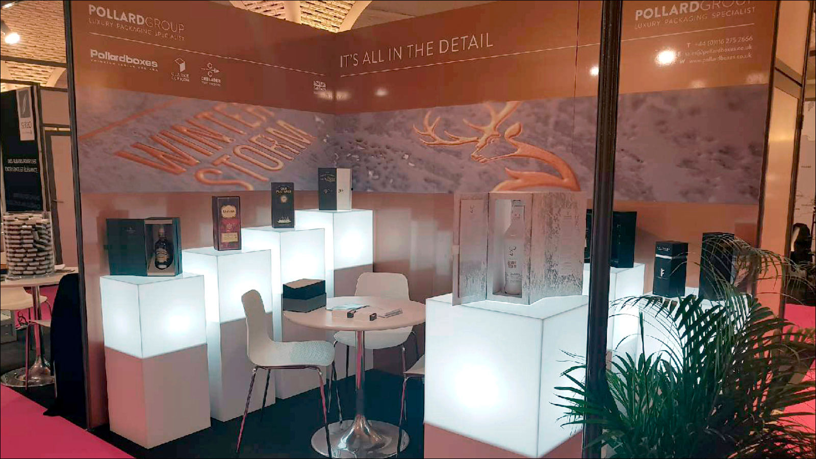 Working closely with the Pollard Group we have produced a mobile display system by creating a range of bespoke, different height, battery powered display plinths which have the top sections internally lit to highlight the high quality packaging products placed on them. These plinths had there first outing at Pack & Spirit 2018 held at the Caveau Castelnau in Reims on April 11th and 12th.