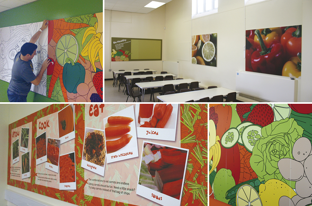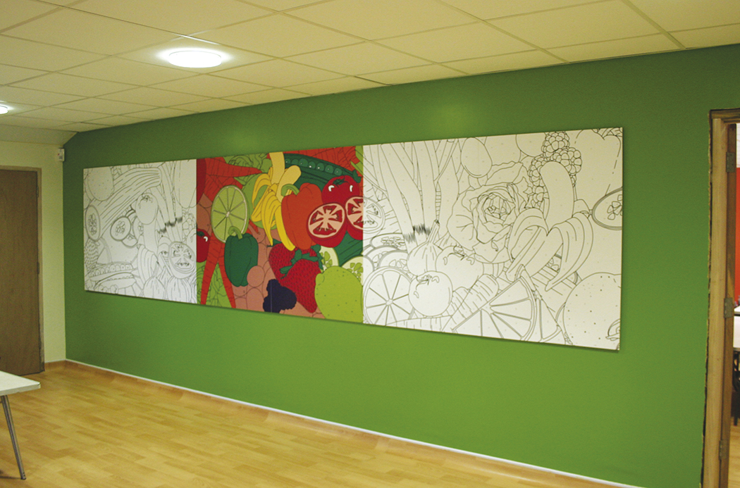 Creation, production and fitting of a range of visually strong, educational, interactive large format display panels and complementary colour schemes to coincide with the large scale refurbishment of Leicester based primary school dining halls. The overall visual theme was to encourage healthy eating. Some panel sections were created in a ‘colour by numbers’ style to allow the pupils to contribute to the final displays.