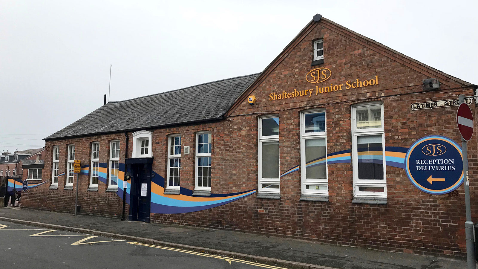 Creation, production and fitting of a new outdoor signage and inspirational display system for Shaftesbury Junior School in Leicester. Colours and visual style developed to visually link to the schools existing brand styling.
